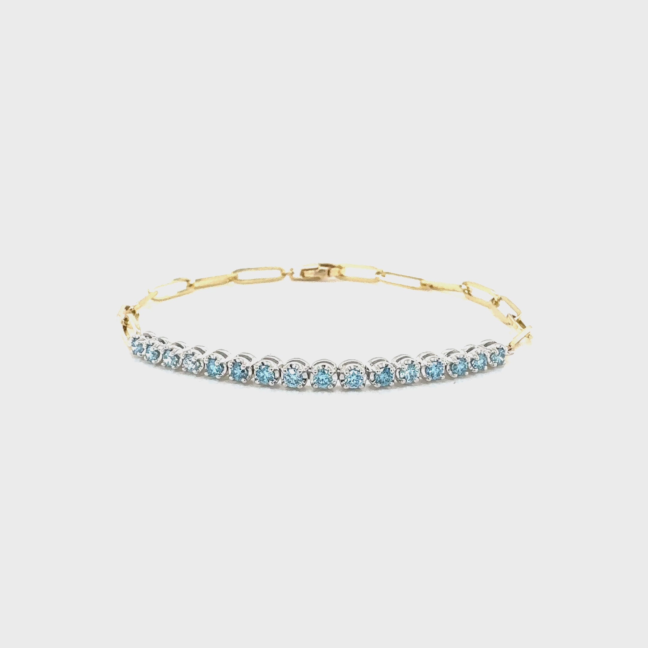 Add a touch of vibrant sophistication with this Lab-Grown Blue Diamond Paper Clip Bracelet, beautifully crafted in 14K Two-Tone Gold (White and Yellow). This elegant bracelet features round-cut lab-grown diamonds totaling 0.57 carats, radiating an intense blue hue that perfectly balances bold color with refined elegance. Each diamond is graded VS clarity, ensuring superior brilliance and precision.