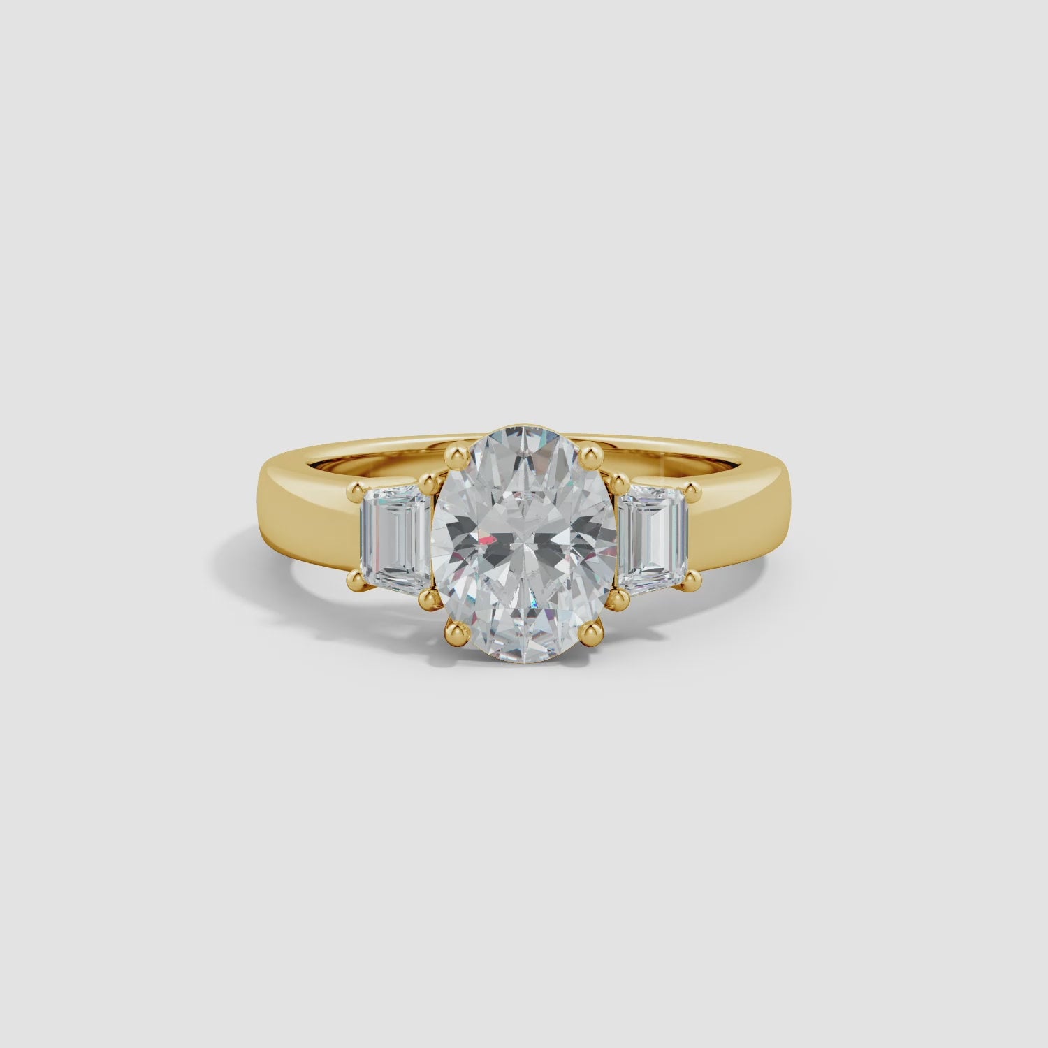 Timeless and elegant, this exquisite three stone engagement ring features a brilliant oval lab-grown diamond flanked by two trapezoid lab-grown diamonds. Each gemstone is prong set, creating a balanced and sophisticated design that symbolizes the past, present, and future. Expertly crafted in graceful 14K Gold, this ring is a meaningful expression of enduring love and commitment.