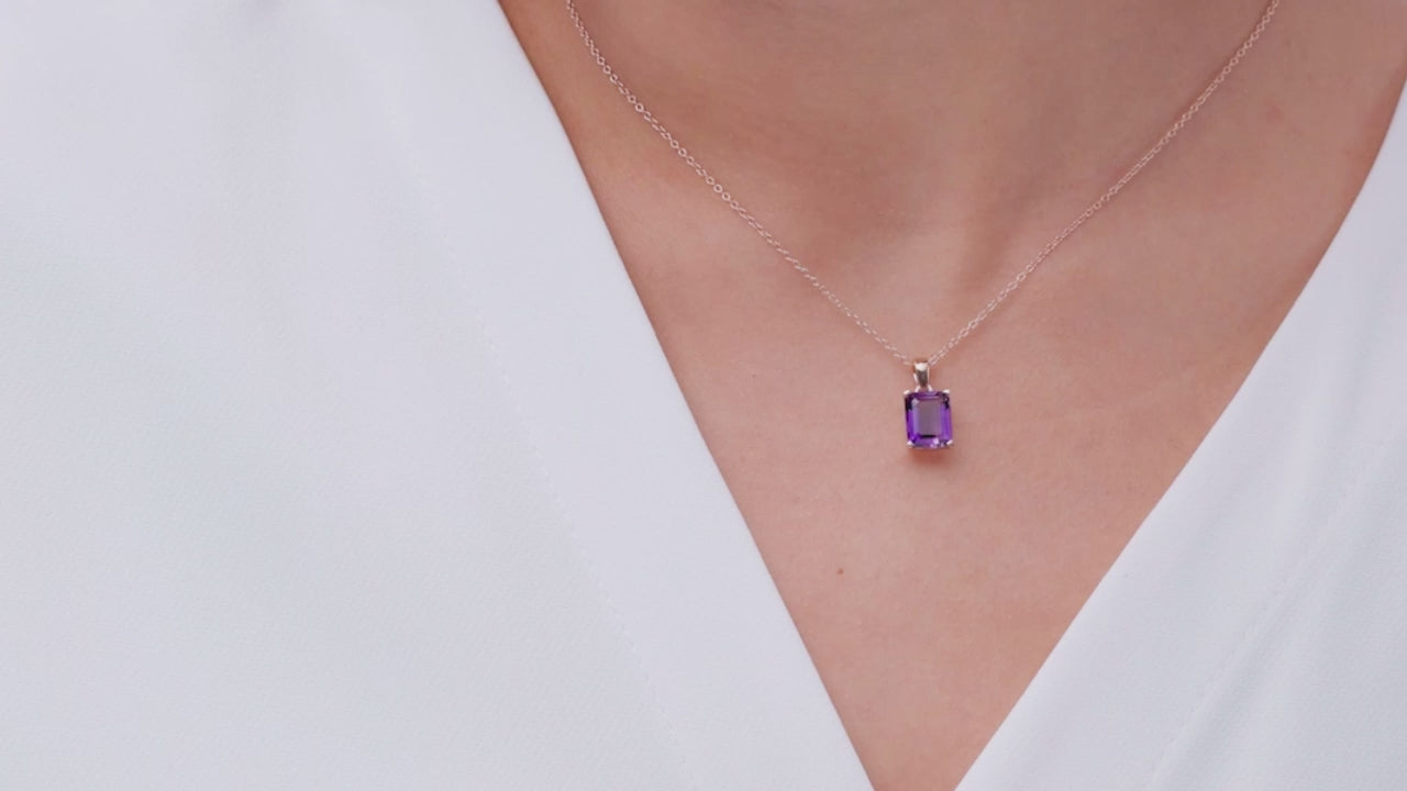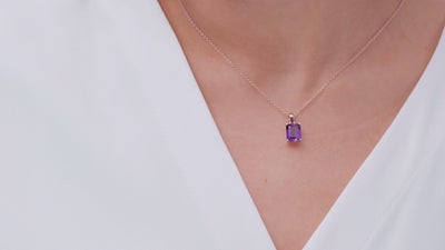 Elegant and timeless, this emerald-cut amethyst solitaire pendant captures attention with its clean lines and vibrant presence. The striking gemstone is set in a classic four-prong setting and gracefully suspended from a polished bale, creating a refined and sophisticated appeal. Expertly crafted in luxurious 14K Gold, this pendant makes a bold yet tasteful statement, perfect for both everyday wear and special occasions.
