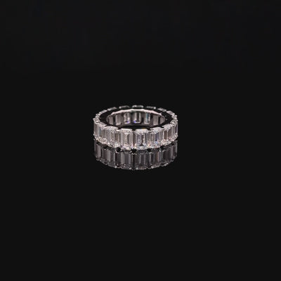 The eternity design symbolizes infinite love and commitment, making it a perfect choice for weddings, anniversaries, or milestone celebrations. The striking emerald-cut diamonds create a refined geometric look, blending modern elegance with classic allure.
