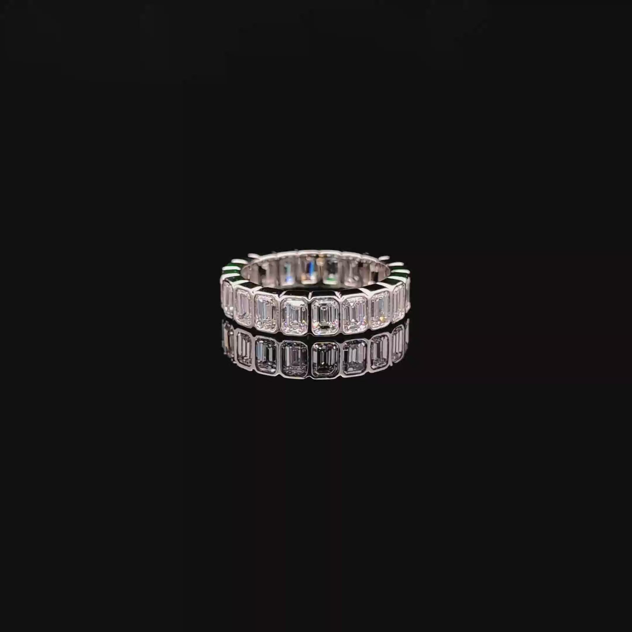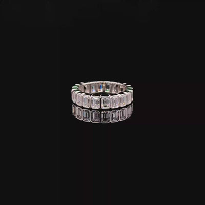 The eternity design symbolizes everlasting love and commitment, making it a meaningful choice for weddings, anniversaries, or milestone occasions. The clean lines of the emerald-cut diamonds paired with the sleek white gold setting create a look of modern luxury and classic grace.