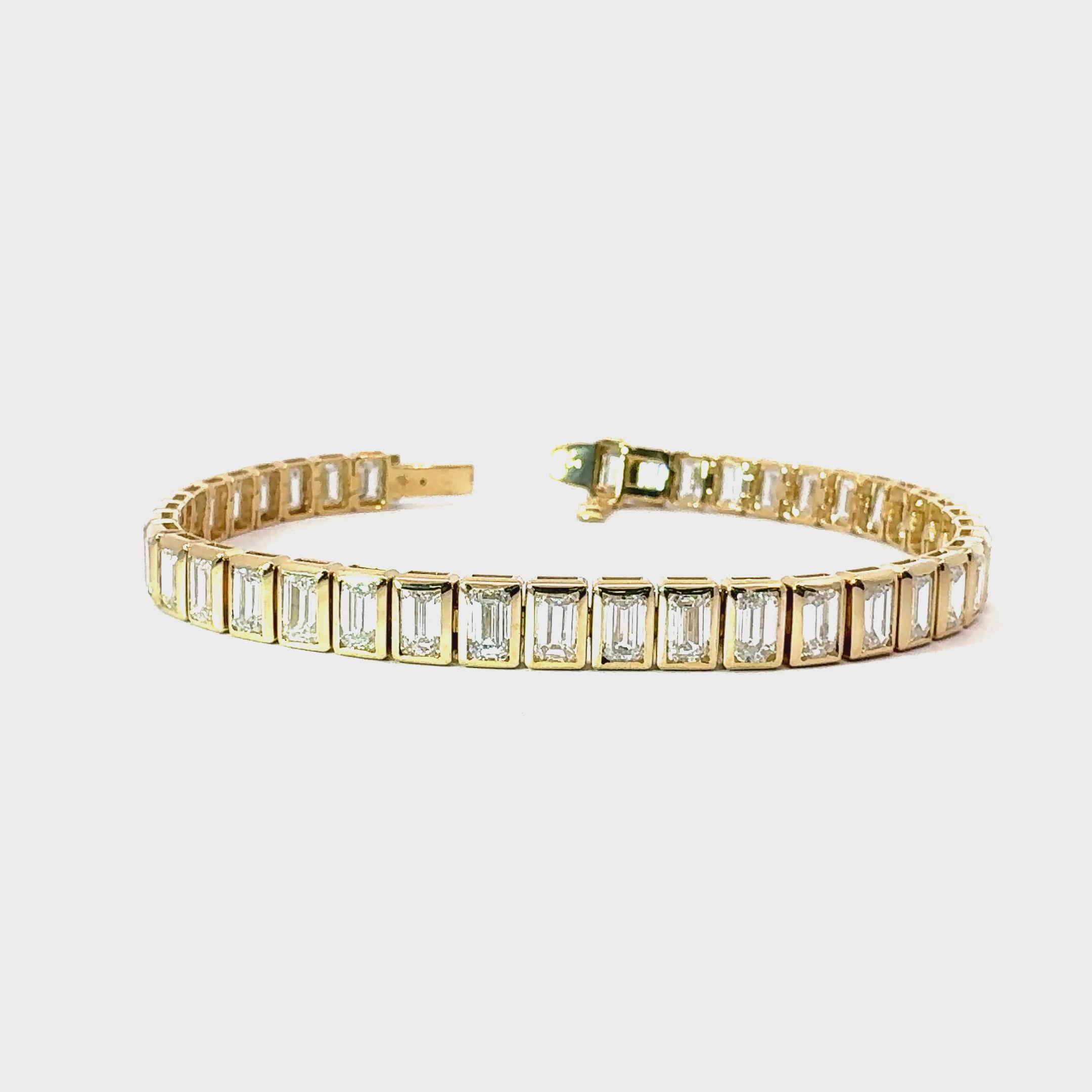 Elevate your elegance with this Lab-Grown Emerald Cut Diamond Tennis Bracelet, beautifully handcrafted in 14K Yellow Gold. This luxurious bracelet features a stunning array of emerald-cut lab-grown diamonds totaling 12.91 carats, radiating a captivating brilliance and modern sophistication. Each diamond is meticulously graded E-F color and VS1 clarity, offering exceptional sparkle, precision, and purity.