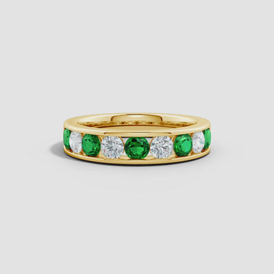 This stunning semi-eternity ring is crafted in 14K Gold and features an alternating channel-set arrangement of round lab-grown emeralds and lab-grown diamonds. The secure channel setting ensures a sleek, continuous look, creating a sophisticated and timeless piece perfect for any special occasion.