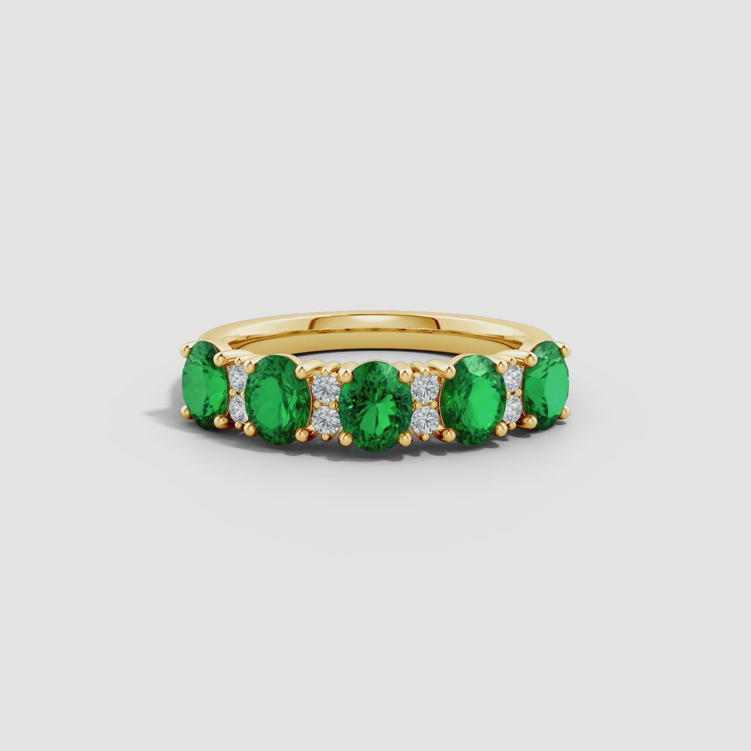 This exquisite five-stone wedding ring combines the elegance of lab-grown oval emeralds with sparkling lab-grown diamonds for a luxurious finish. Expertly crafted in 14K Gold, the prong-set gemstones are arranged to create a harmonious and sophisticated design, perfect for celebrating a special moment or enhancing any jewelry collection.