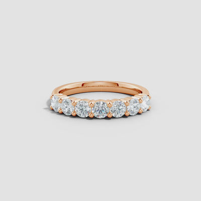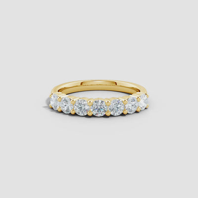 This timeless half eternity wedding ring showcases seven brilliant round lab-grown diamonds, elegantly set in a shared prong design. Crafted to perfection, it embodies a harmonious balance of brilliance and sophistication, making it a beautiful symbol of everlasting love. Expertly made in luxurious 14K Gold, this dazzling ring pairs effortlessly with engagement rings or stands alone as a refined statement piece.