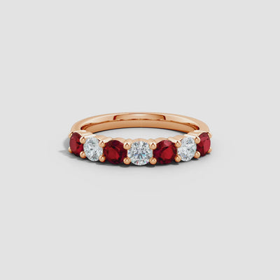 This elegant half eternity wedding ring is crafted in 14K Gold and showcases alternating prong-set lab-grown round rubies and lab-grown round diamonds. The design offers a refined, continuous sparkle, making it a timeless choice for weddings and special occasions.