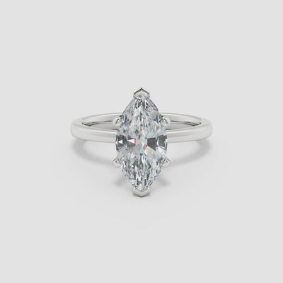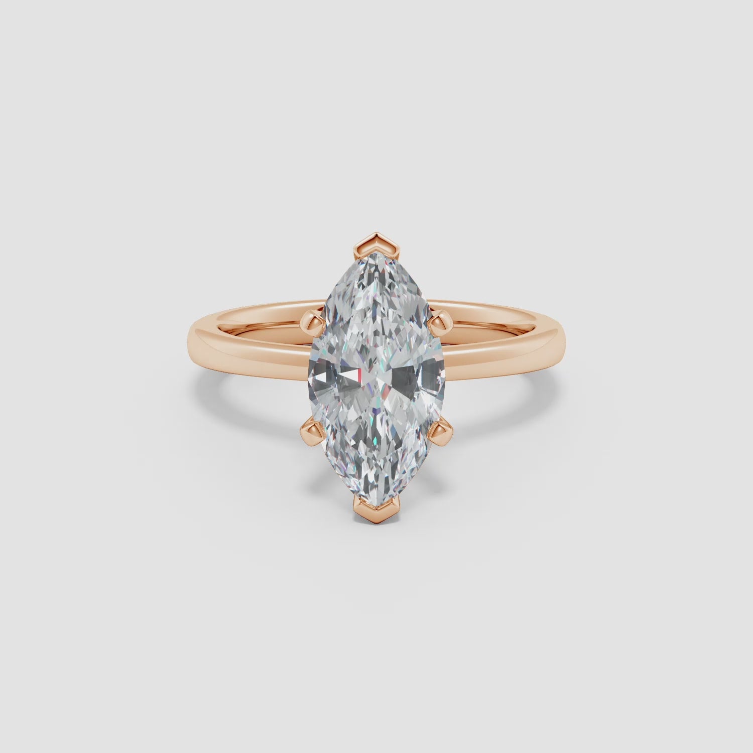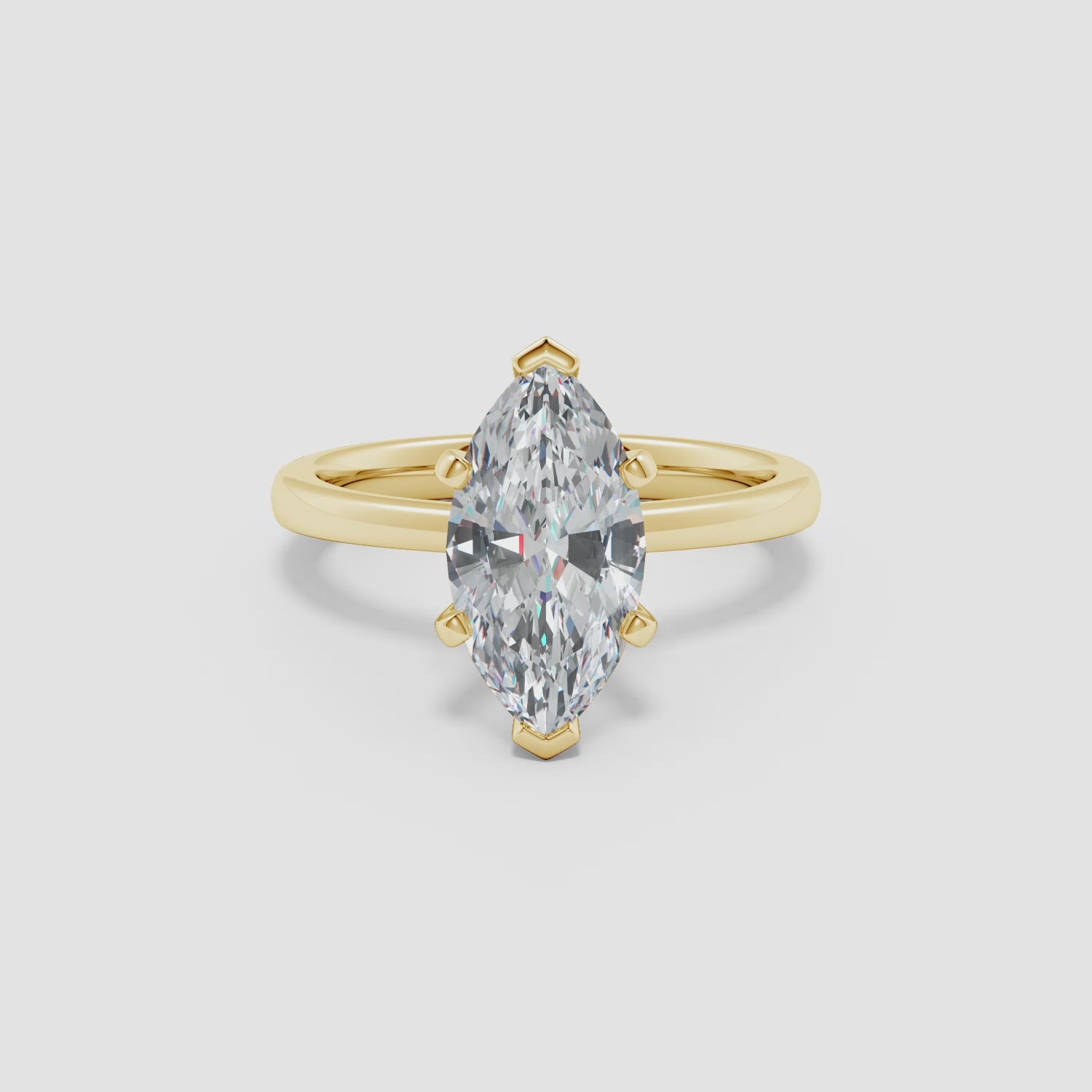 Radiating striking beauty, this solitaire engagement ring showcases a captivating marquise lab-grown diamond secured in a four-prong setting. The elongated diamond shape is elegantly complemented by a reverse tapered shank, providing a graceful balance of refinement and brilliance. Expertly crafted in timeless 14K Gold, this ring is a sophisticated statement of enduring love and classic elegance.