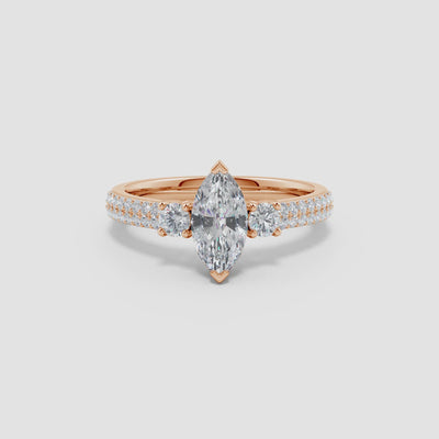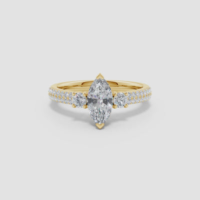 Graceful and modern, this engagement ring showcases a brilliant play of design and sparkle. At its center, a captivating marquise lab-grown diamond steals the spotlight, flanked by two shimmering round lab-grown diamonds. Additional lab-grown diamond accents are intricately set along the distinctive knife-edge shank, enhancing the ring’s brilliance and detail. Expertly crafted in refined 14K Gold, this ring is a stunning symbol of elegance and everlasting love.