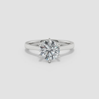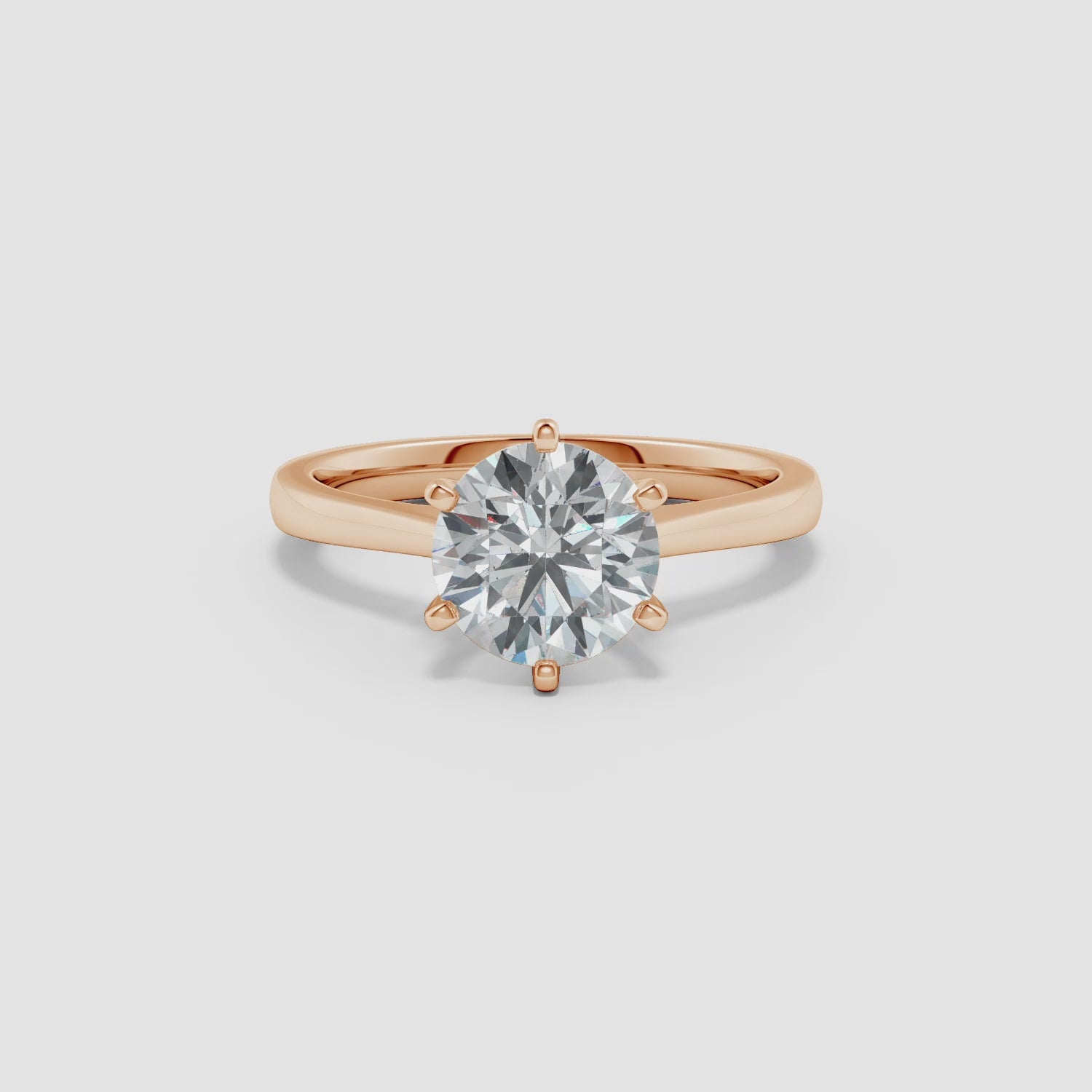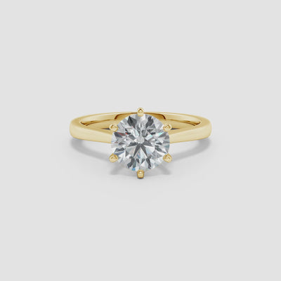 Brimming with graceful elegance, this solitaire engagement ring showcases a captivating round lab-grown diamond in a classic six-prong cathedral setting. The diamond is set on a polished reverse tapered shank, adding architectural beauty and refinement to the design. Expertly crafted in exquisite 14K Gold, this ring is the perfect blend of traditional charm and modern sophistication—an enduring symbol of love.