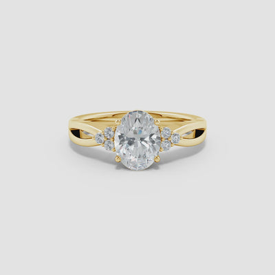 Stylish and refined, this solitaire engagement ring presents a stunning oval lab-grown diamond as its centerpiece. The diamond is securely prong set atop an elegant split shank that adds modern flair to the classic design. Trio clusters of round lab-grown diamonds on each side of the center stone enhance the brilliance and elevate the overall elegance. Expertly crafted in timeless 14K Gold, this ring offers a perfect balance of sophistication and sparkle.