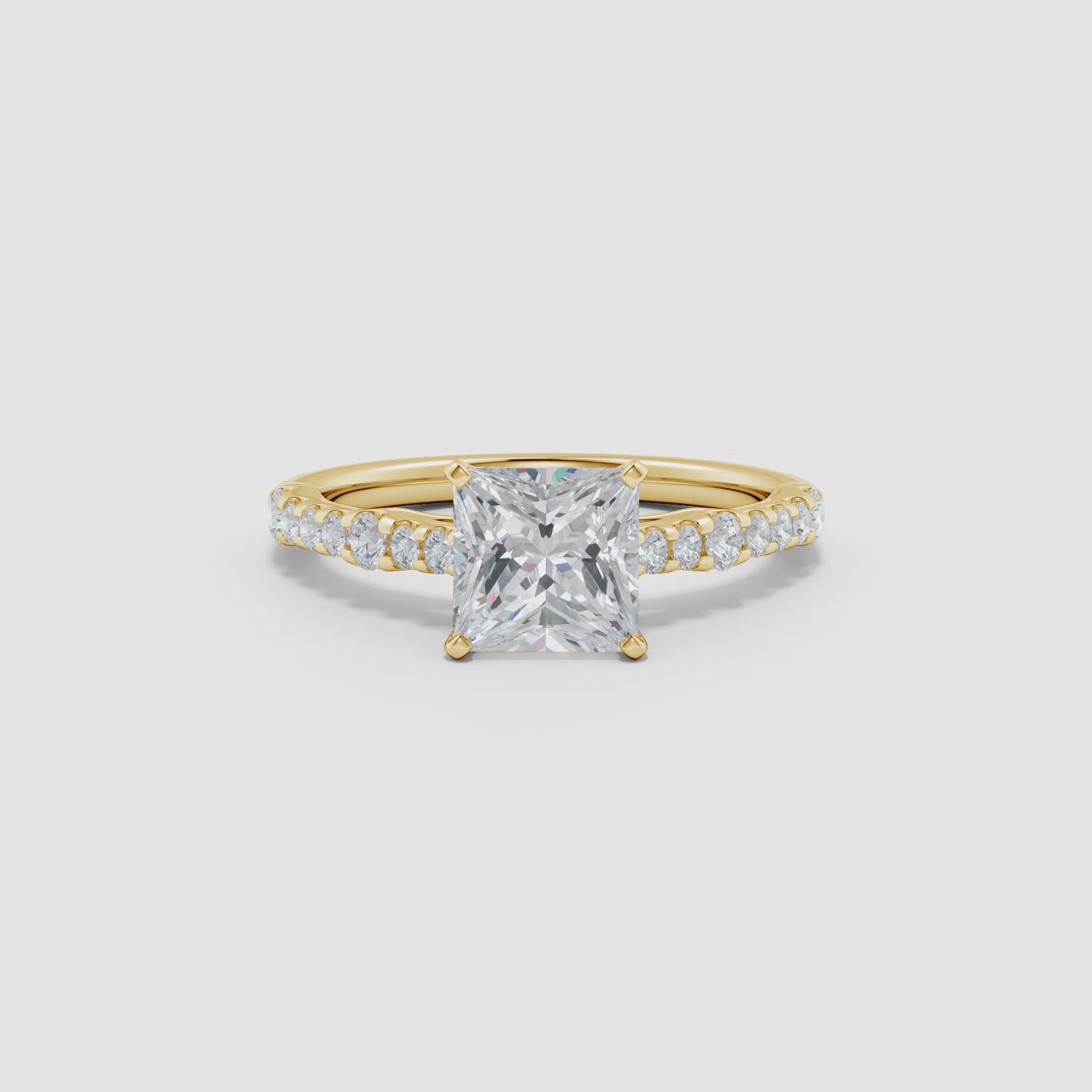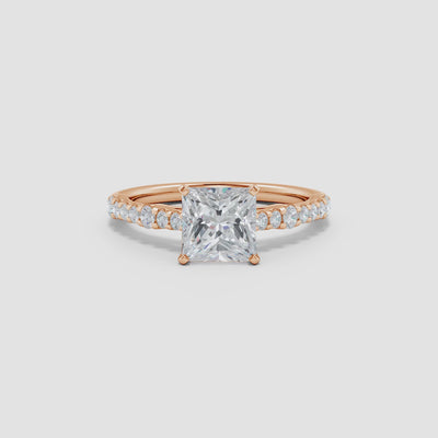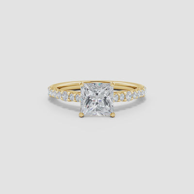 Designed with refined elegance, this solitaire engagement ring features a striking princess-cut lab-grown diamond at its heart. Securely peg-set, the center stone radiates clean lines and brilliance. Along the sleek 14K gold shank, sparkling station-set round lab-grown diamonds add a touch of shine and modern sophistication. Expertly crafted, this exquisite ring perfectly blends timeless beauty with contemporary charm.