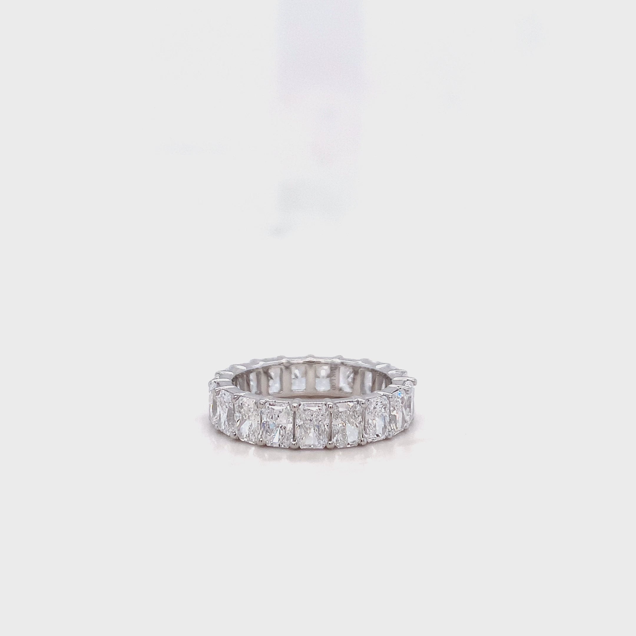 The eternity design symbolizes everlasting love and grace, making it an ideal choice for weddings, anniversaries, or milestone celebrations. The elongated radiant-cut diamonds create a sleek and modern silhouette, beautifully complemented by the polished white gold band.