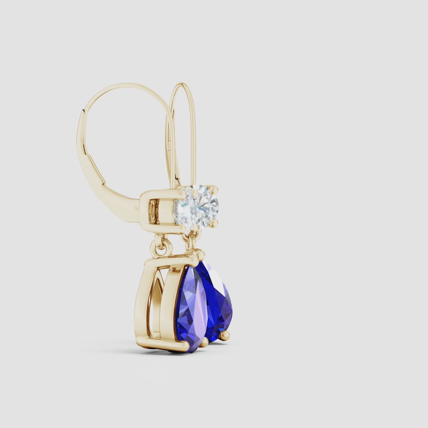 Graceful and refined, these pear sapphire leverback drop earrings capture timeless sophistication. Each earring showcases a captivating pear-shaped lab-grown sapphire, delicately accented by a sparkling round lab-grown diamond at the top. The combination of the vivid sapphire and the brilliant diamond creates an elegant balance of color and light. Expertly crafted in luxurious 14K Gold, these earrings are designed with secure lever backs for comfort and effortless style, making them perfect for both everyday elegance and special occasions.