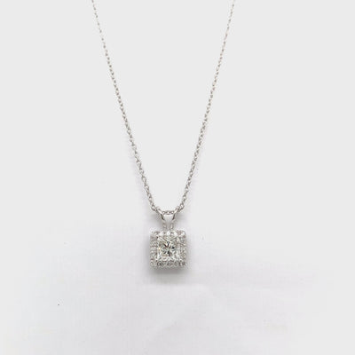 Add a radiant touch of sophistication with this Lab-Grown Princess Halo Diamond Pendant, elegantly crafted in 14K White Gold. This stunning pendant showcases a princess-cut lab-grown diamond surrounded by a dazzling halo of smaller diamonds, with a total carat weight of 0.56. Each diamond is graded G-H color and VS clarity, ensuring superior sparkle, fire, and brilliance.